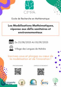 Ecole CIMPA: Modélisations mathématiques, réponses aux défis sanitaires et environnementaux, du 25/08/2025 à 05/09/2025, Village des langues, Mahdia, Tunisie.