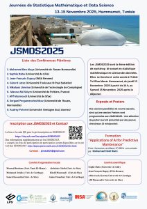 Ces Journées sont la 4ème édition de ces rencontres biannuelles qui ont pour objectif de présenter et d’échanger des résultats récents en statistique mathématique et ses applications en sciences des données. Les JSMDS2025 auront lieu cette année à Hammamet du 13 au 15 Novembre 2025. Une attention particulière est portée aux échanges avec les doctorants, post-docteurs et jeunes chercheurs. En plus des conférences plénières et des courts exposés, une session de poster ainsi qu’une formation certifiante “Applications of AI for Predictive Maintenance” sont programmés aux JSMDS2025. Pour plus d’informations, voir l’affiche des JSMDS2025 qui est téléchargeable à partir du lien :