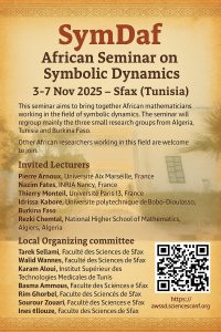 This seminar aims to bring together African mathematicians working in the field of symbolic dynamics. The seminar will regroup mainly the three small research groups from Algeria, Tunisia and Burkina Faso. Other African researchers working in this field are welcome to join. This is a follow on activity of the Algerian-Tunisian Meeting on Symbolic Dynamics. https://ratds22.sciencesconf.org/ The SYM-DAF Wandering seminar is an iniative of the SYM-DAF project. The registration fee is 90 euros. PhD students and postdoctoral researchers may request financial support from the organizers and, in particular, may be exempted from the registration fee. The Poster of the SYM-DAF can be downloaded via the link :