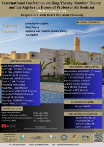 International Conference On Ring Theory, Number Theory and Lie Algebra In Honor of Professor Ali Benhissi Monastir, 28-31 October 2025.